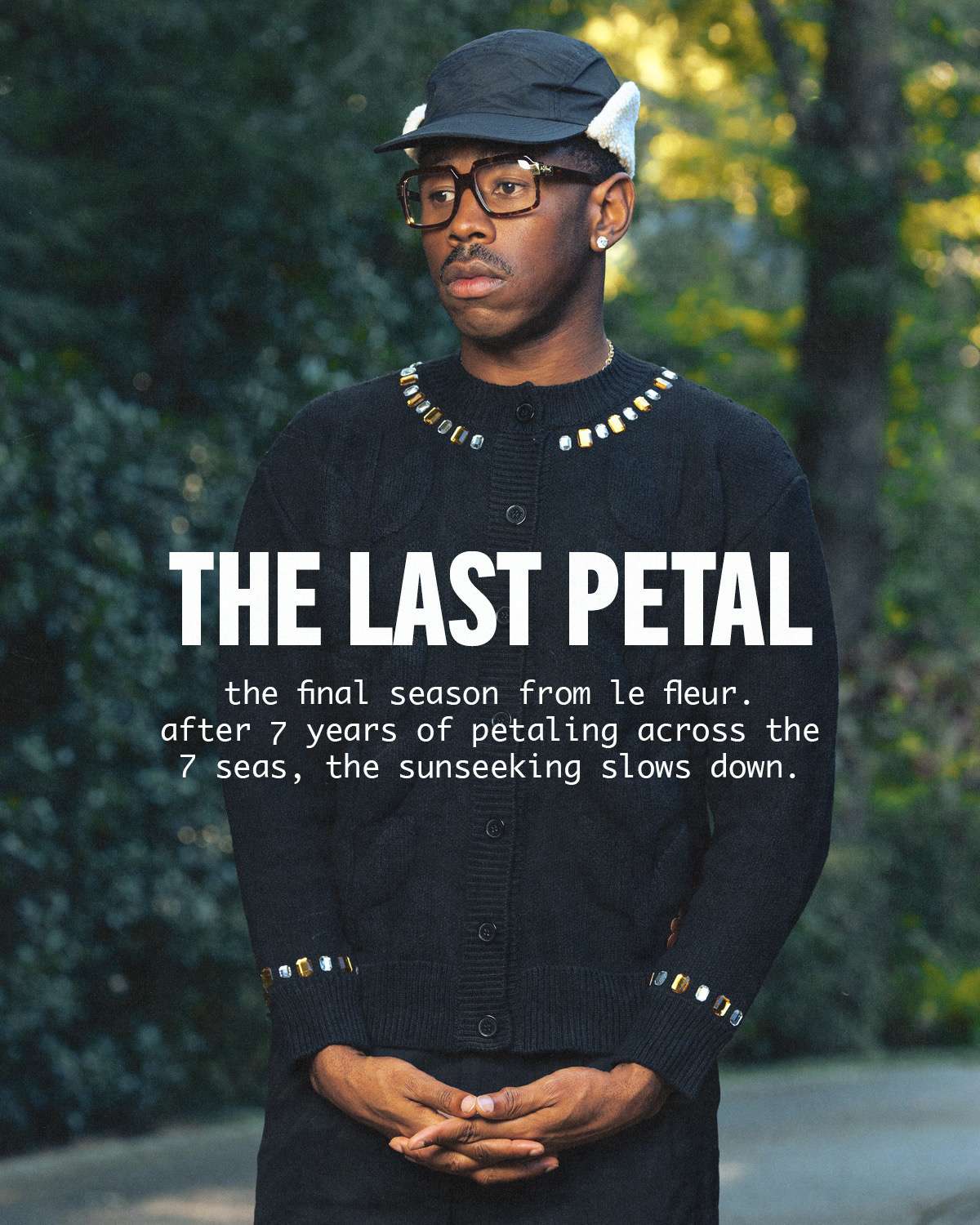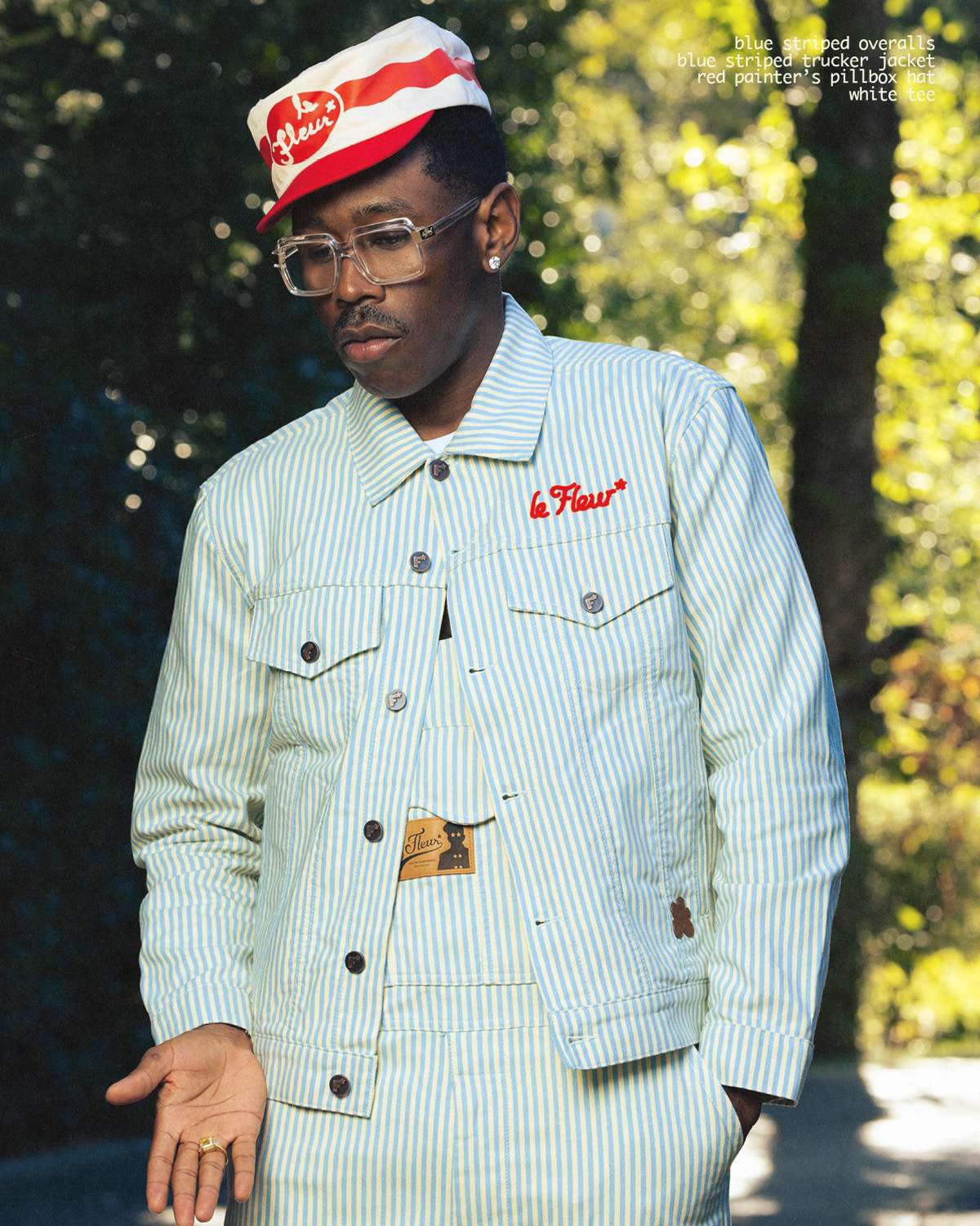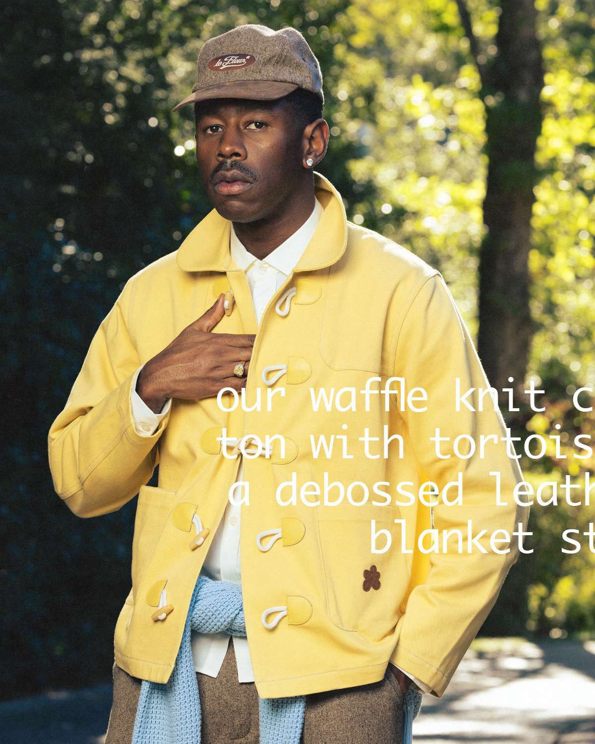 Season 4 is modeled by founder Tyler, The Creator and photographed by Luis “Panch” Perez, highlighting a mix of new silhouettes and signature le FLEUR* staples. Standout pieces include a denim toggle jacket with matching trousers, waffle-knit crewnecks, a Tencel trench coat, potato-sack blazer and shorts set, striped denim overalls and jacket, a blanket parka, gemstone cardigan, floral anorak, pleated trousers, round-collar blouse, zaire camo shorts with bucket hat, and a beret featuring the brand’s floral emblem. The range also features the brand’s beloved headwear styles, from pillbox to camp hats.