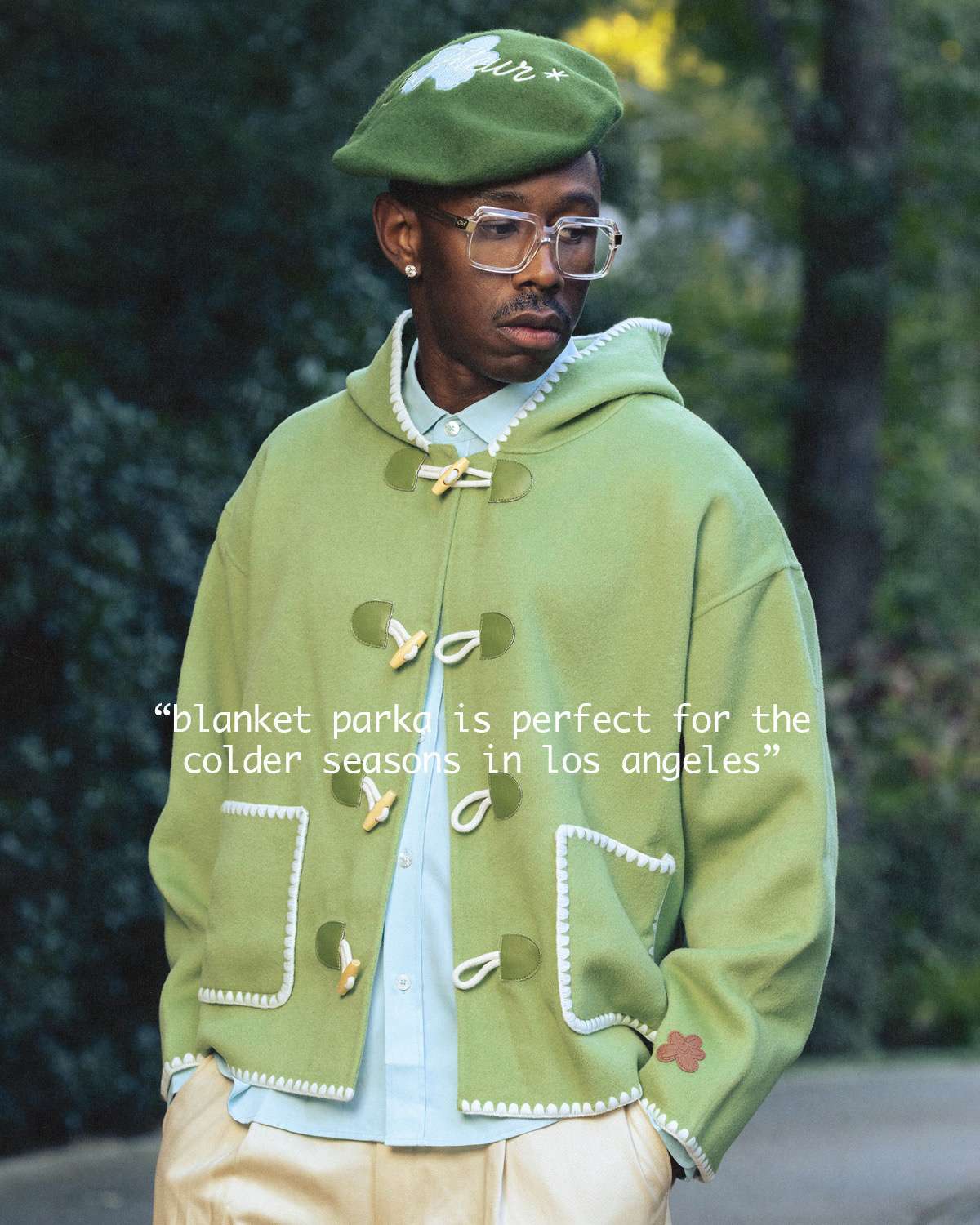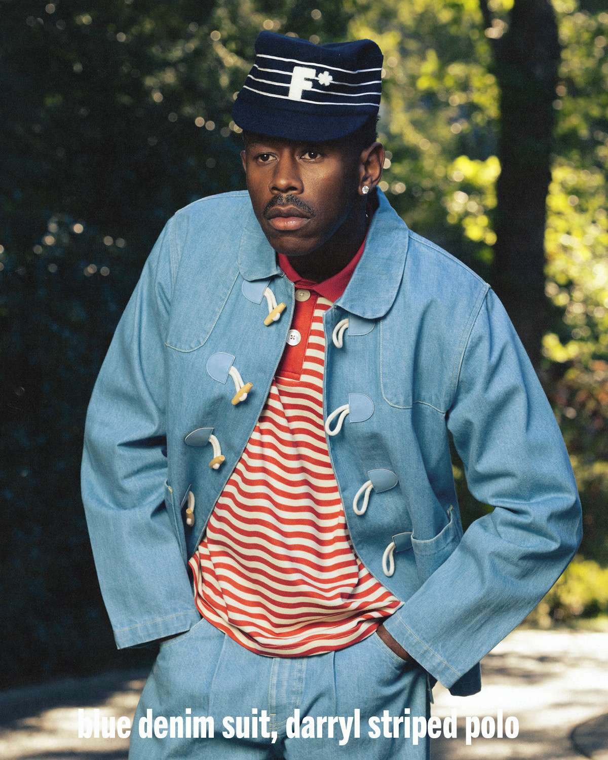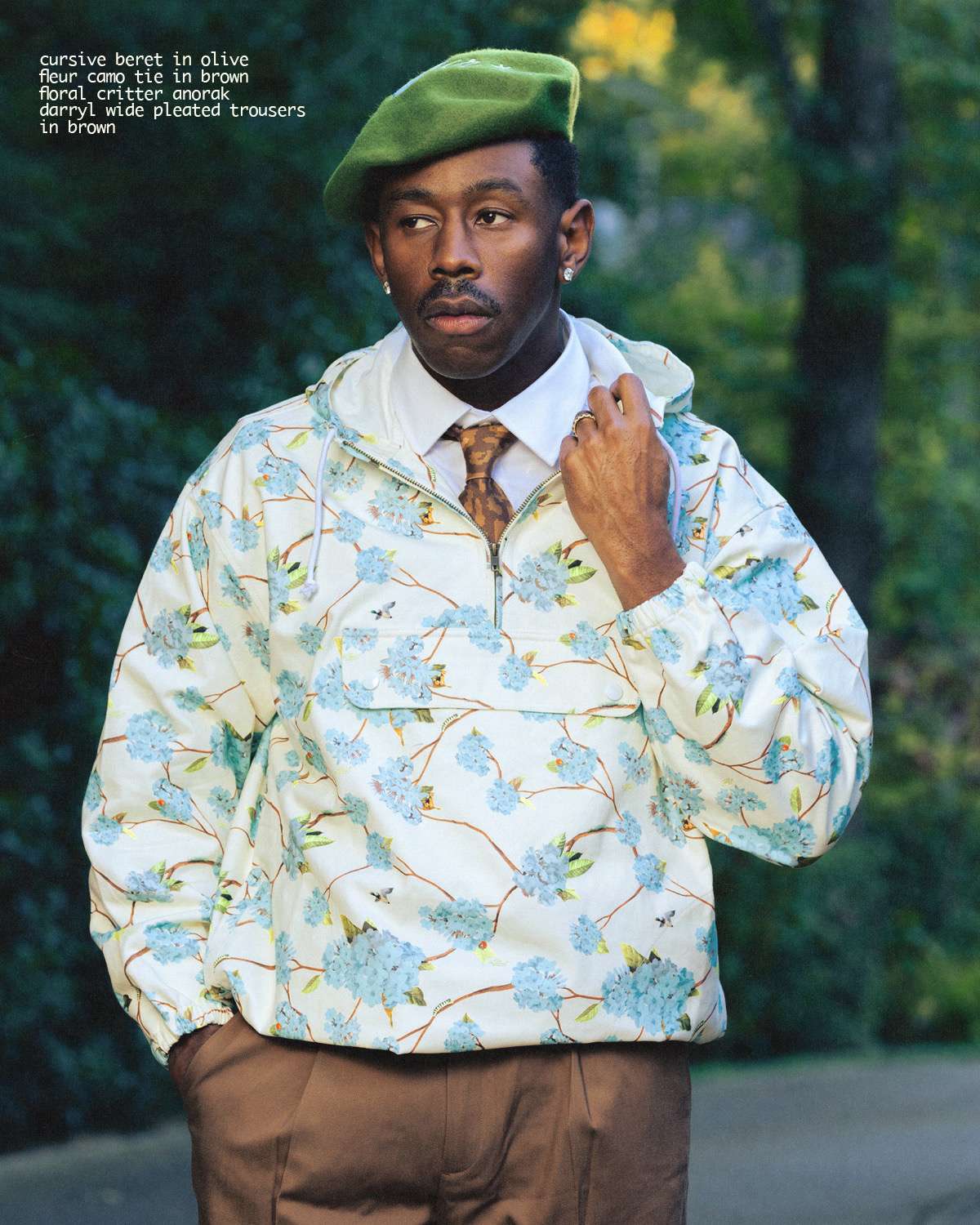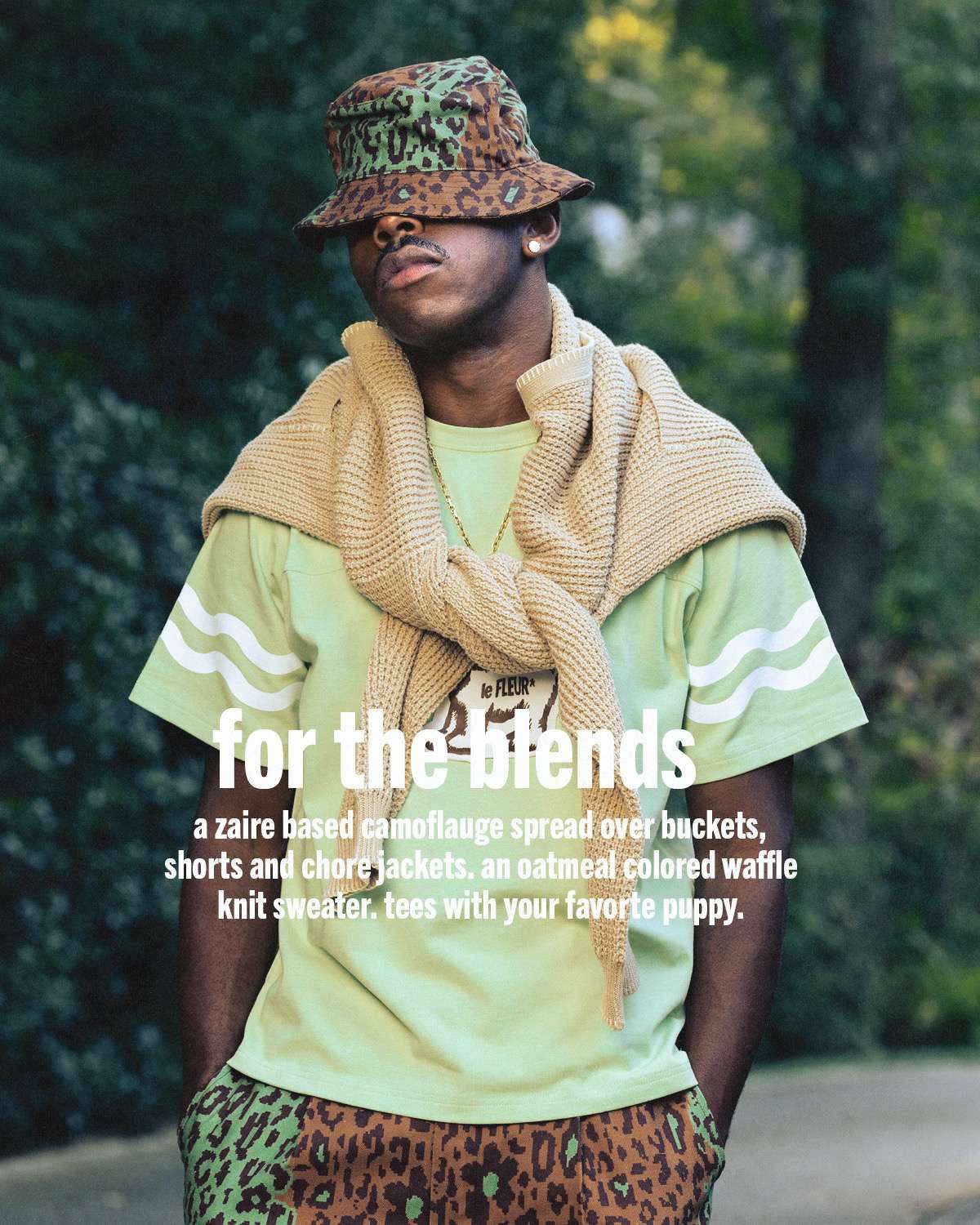 Season 4 is modeled by founder Tyler, The Creator and photographed by Luis “Panch” Perez, highlighting a mix of new silhouettes and signature le FLEUR* staples. Standout pieces include a denim toggle jacket with matching trousers, waffle-knit crewnecks, a Tencel trench coat, potato-sack blazer and shorts set, striped denim overalls and jacket, a blanket parka, gemstone cardigan, floral anorak, pleated trousers, round-collar blouse, zaire camo shorts with bucket hat, and a beret featuring the brand’s floral emblem. The range also features the brand’s beloved headwear styles, from pillbox to camp hats.