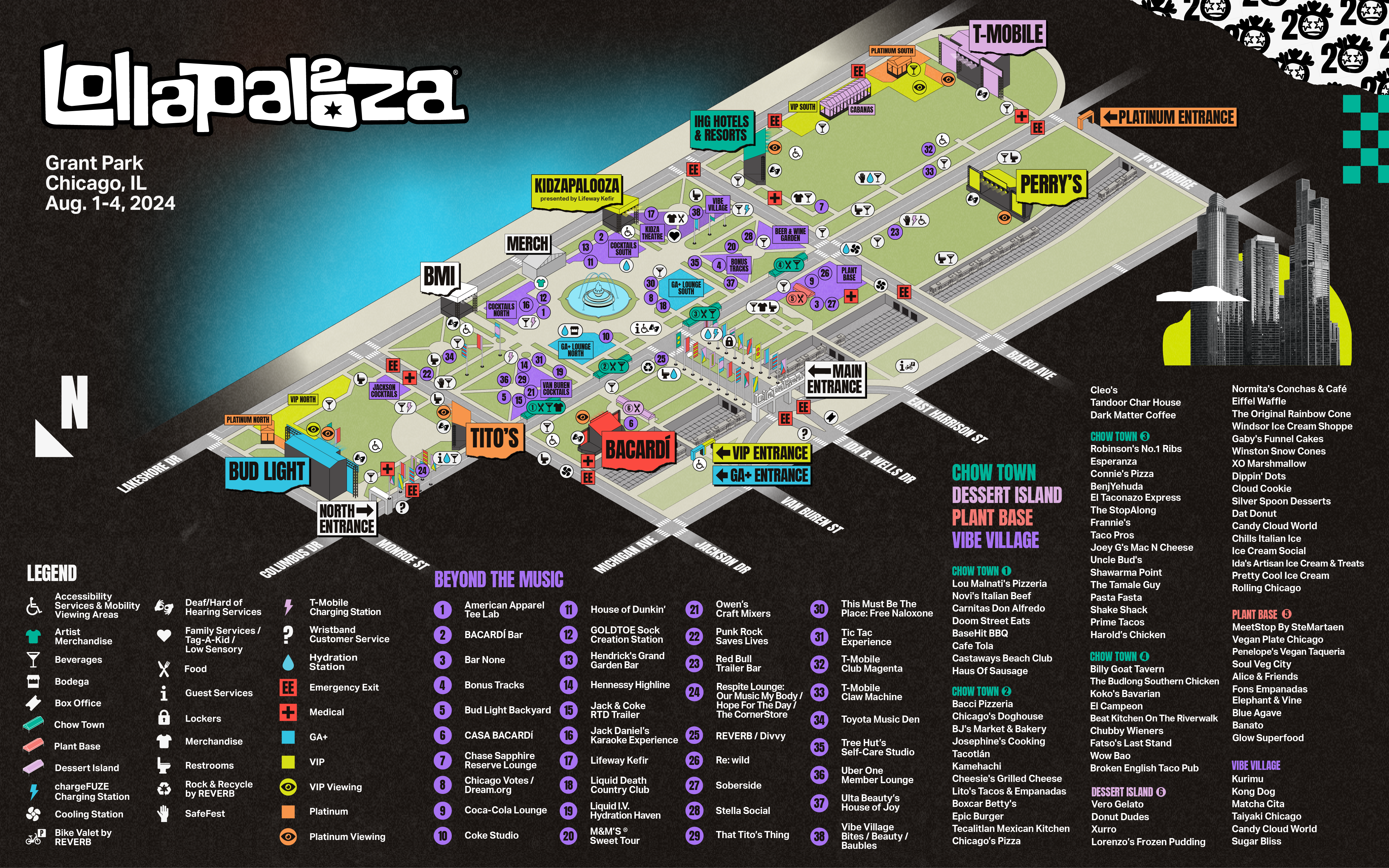 American Apparel Tee Lab, CASA BACARDÍ, Bud Light Backyard, Chase Sapphire Reserve Lounge, Coke Studio, House of Dunkin’, GOLDTOE Sock Creation Station, Hendrick’s Grand Garden Bar, Hennessy Highline, Jack Daniel’s Music & Karaoke Experience, Jack Daniel’s & Coca-Cola Ready-to-Drink Trailer, Kim Crawford Wines, Lifeway Kefir, Liquid Death Country Club, Liquid I.V. Hydration Haven, M&M’S ® Sweet Tour, Owen’s Craft Mixers, Red Bull Trailer Bar, Stella Artois x Hot Ones, Get the deep dish on Lolla!, T-Mobile Club Magenta, Tic Tac Experience, Lolla with Tito’s, The Toyota Music Den, Tree Hut’s Self-Care Studio, Uber One Member Lounge, Ulta Beauty’s House of Joy, Bonus Tracks stage, Vibe Village